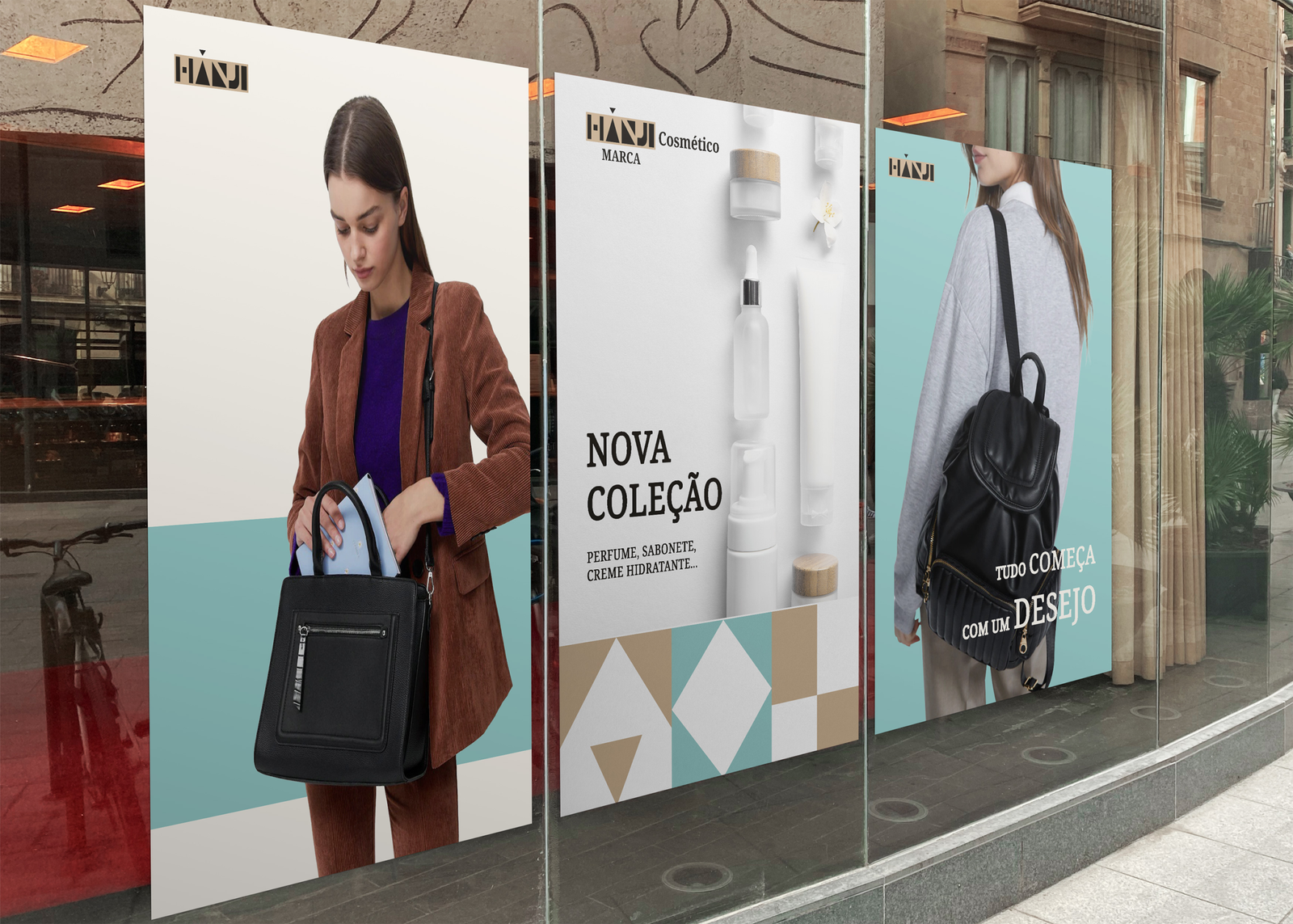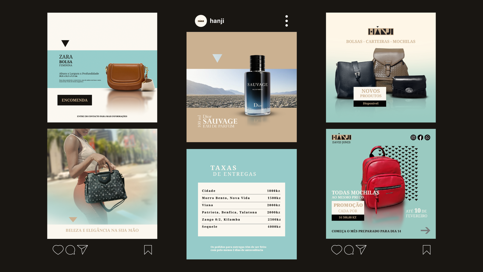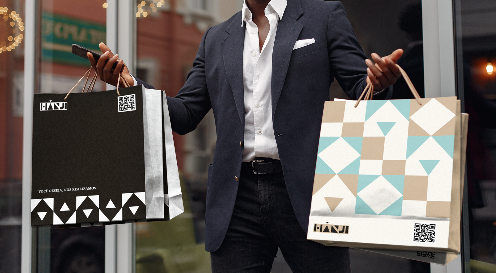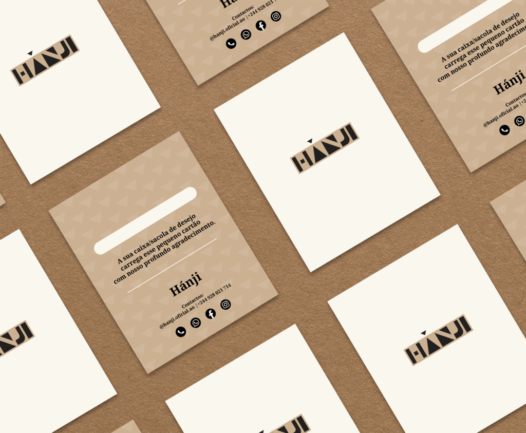 The company needed an identity capable of standing out among competitors, establishing itself as a modern and elegant African brand. The challenge involved creating visual elements applied to shopping bags, linings, posters, social media, thank-you cards, and labels that also functioned as business cards.